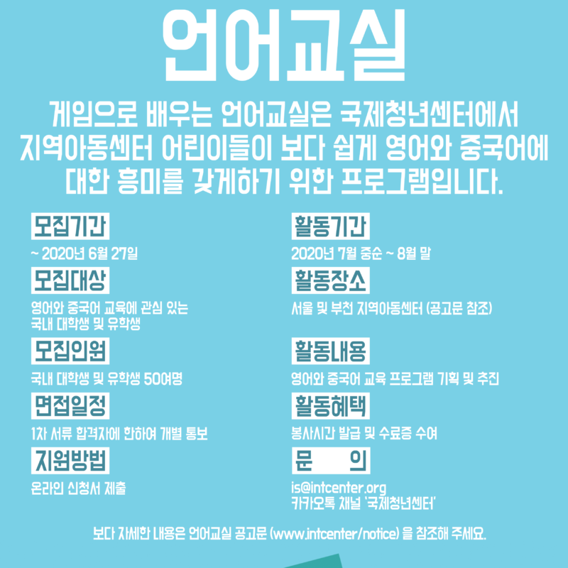 ‘게임으로 배우는 영어/ 중국어 교실’ 교육봉사자 모집(서울, 부천, 인천, 용인 지역) Notice ‘게임으로 배우는 영어/ 중국어 교실’ 교육봉사자 모집(서울, 부천, 인천, 용인 지역)